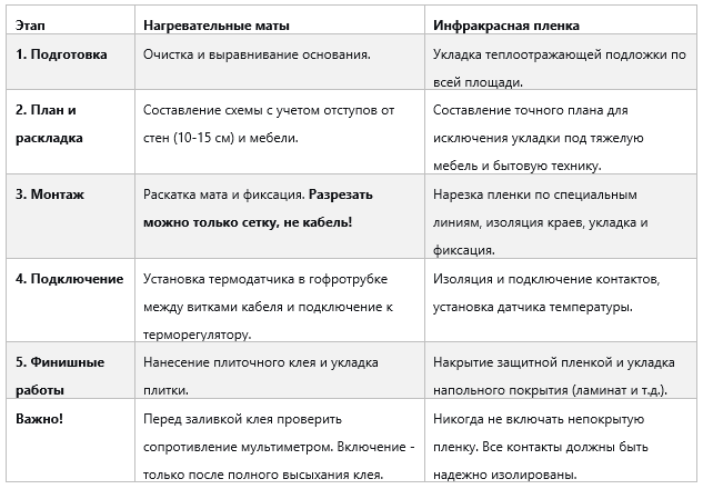 Процесс монтажа для обеих систем включает подготовку основания, укладку и подключение к терморегулятору. Основные отличия представлены в таблице ниже.